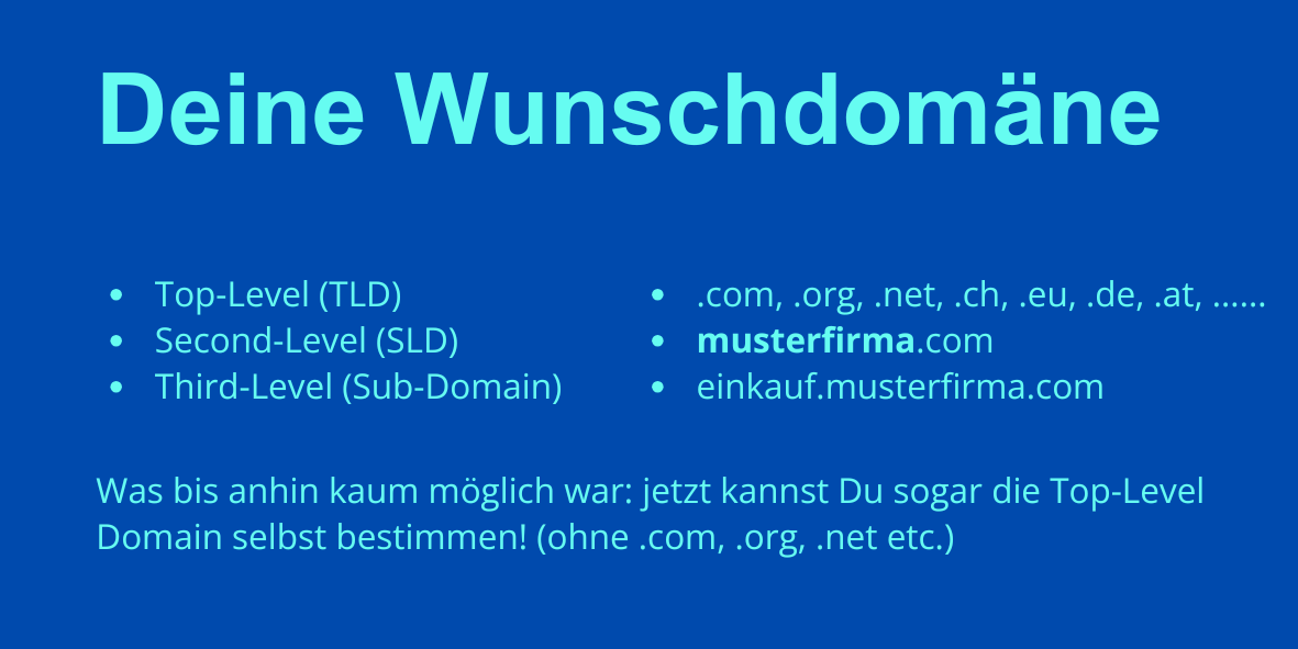 Noch günstiger (ab ca. CHF 250.-) max.muster@wallet oder @blockchain etc. Aktuell gibt es etwa 200 recht günstige Top-Level domains zur Auswahl.